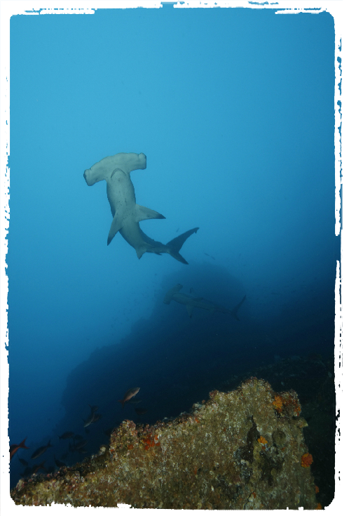 where we saw many hammerheads, white tip reef sharks, and schooling fish. During the second dive at Punta Carrion, I noticed a skeleton underwater at approximately thirty metres. Bewildered, I thought to myself, “Who’d thrown their dog overboard?” Upon surfacing, and speaking to one of the dive masters, I realized that we’d seen the skeleton of a sea lion. Doh! Towards the end of the second dive, we experienced a really strange vertical thermocline current coming in. The water temperature dropped by at least 3-5 degrees and the visibility went down to less than 5m. However, this cold, nutrient rich water seemed to bring in many fish and we experienced sightings of huge groupers, who seemed to enjoying appearing from the depths and scaring us!