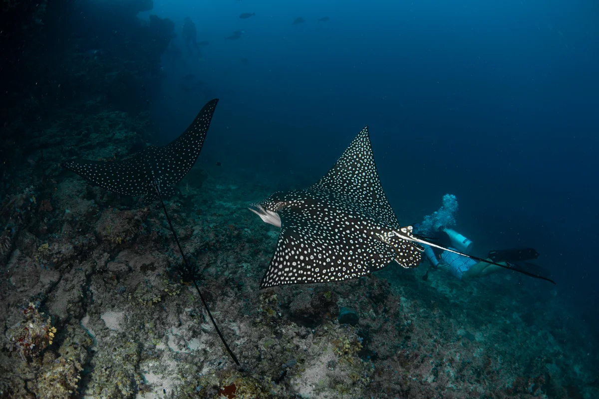 On the South side of Thaa Atoll, large numbers of schooling fish draw reef sharks and tuna from the blue beyond along the walls and channel opening on the hunt for an easy meal. Eagle rays can often be seen foraging for crustaceans amongst the sand and corals, or scooping up discarded fish morsels.