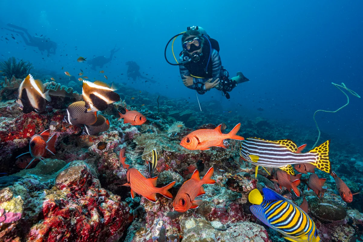 Heading north and west from the capital city of Malé, the vast number of sites across this atoll feature vibrant coral formations, abundant marine life, and opportunities for channel and drift diving.