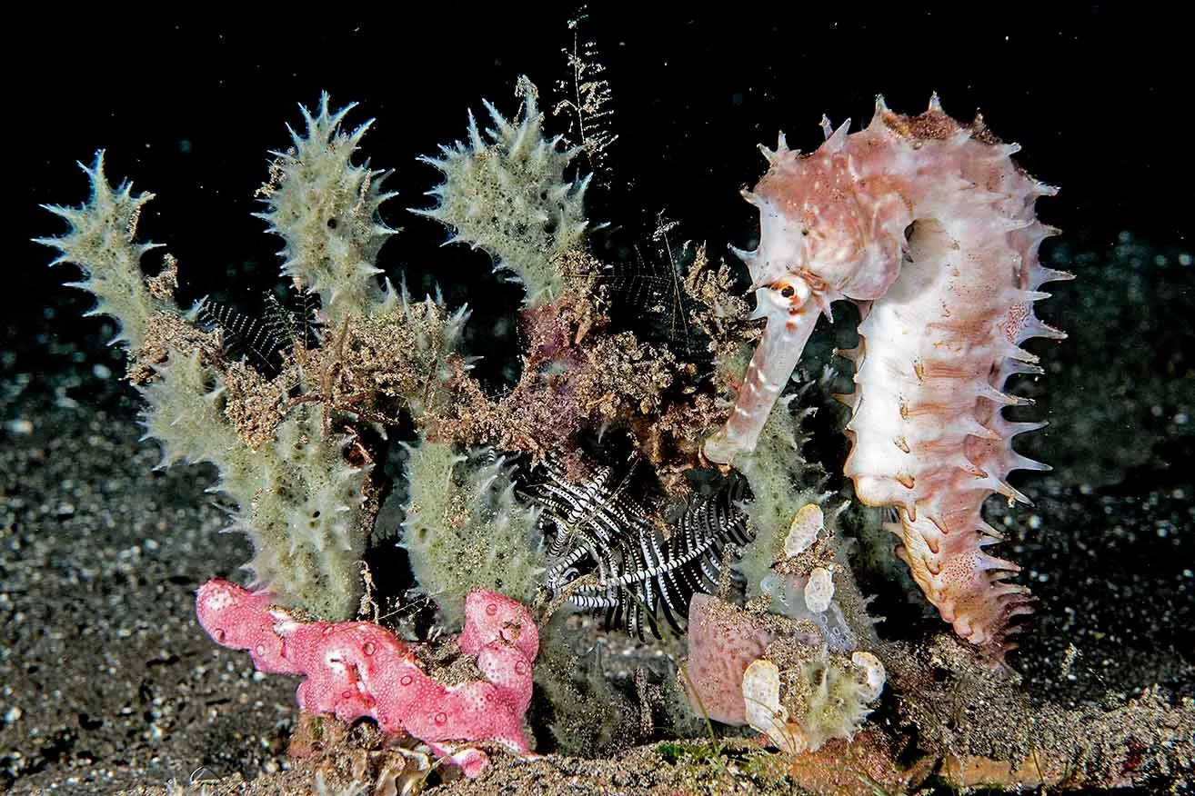 Underwater the topography of dive sites varies from shallow sandy fringing reefs to steep walls dotted with seafans and sponges, whilst a couple of small plane wrecks and cars at Dauin have formed artificial reefs. Marine life is diverse; however common sightings include green and hawksbill turtles and schools of barracuda and jacks, whilst redtooth trigger fish, pyramid butterfly fish and blue lined fusiliers are seen on almost each dive in huge numbers. Smaller creatures such as frogfish, ghost pipefish, octopus and pygmy seahorses are found at several of the dive sites and of course a wide range of nudibranchs, shrimps and crabs can be found on each reef.
